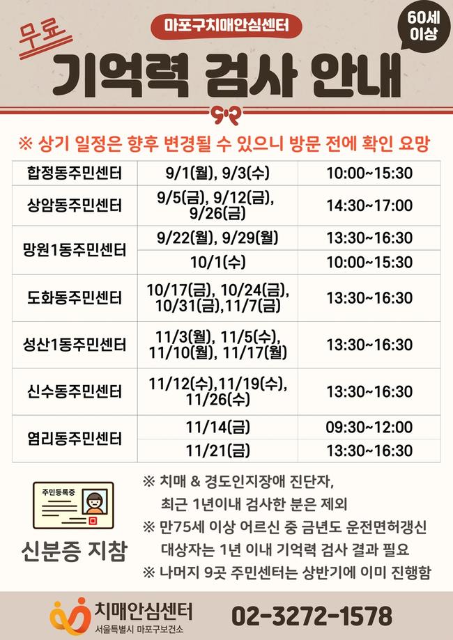 자세한 내용은 마포구치매안심센터(02-3272-1578)로 문의하면 된다.