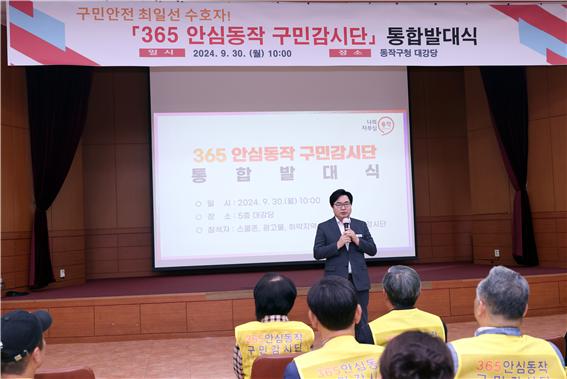 365 안심동작 구민감시단 통합발대식에서 인사말을 하는 박일하 동작구청장.