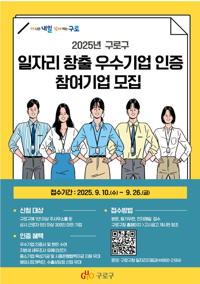 구로구가 관내 중소기업의 성장을 돕고 지역 일자리를 확대하기 위해 ‘2025년 일자리 창출 우수기업 인증’ 참여기업을 모집한다.