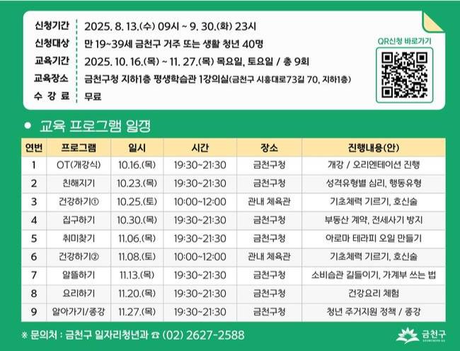 프로그램은 금천구에 거주하거나 활동 중인 만 19세∼39세 청년을 대상으로 무료로 운영한다. 참여 신청 및 세부 내용은 금천구청 누리집 또는 금천구청 통합예약시스템에서 확인 가능하다.