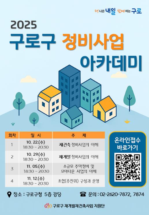 구로구 정비사업 아카데미 홍보 포스터.구로구(구청장 장인홍)는 10월 22일부터 11월 12일까지 매주 수요일 오후 6시 30분 구청 강당에서 ‘2025 구로구 정비사업 아카데미’를 운영한다고 밝혔다.