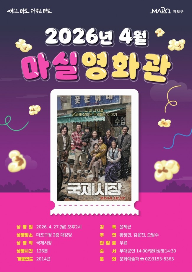 오는 4월 27일(월) 오후 2시에는 마포구청 대강당에서 1,000만 관객수를 돌파한 영화 `국제시장`이 상영될 예정이다.
