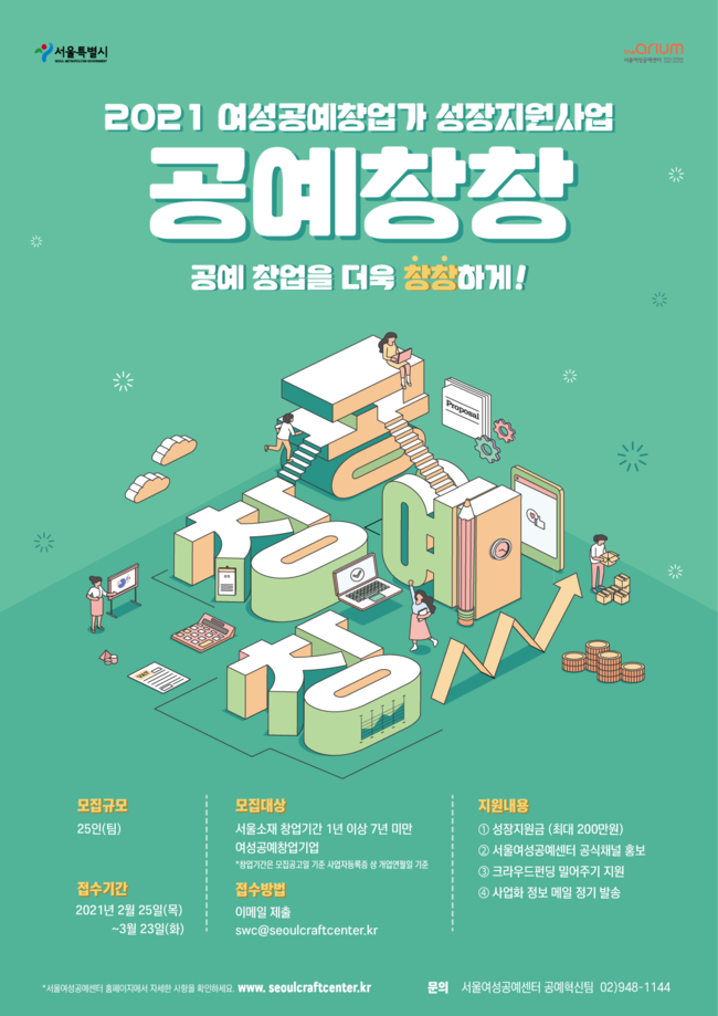 ‘2021 여성공예창업가 성장지원사업 공예창창’의 모집기간은 오는 23일까지며, 서울여성공예센터 홈페이지 공고사항 확인 후 신청서, 개인정보 제공 동의서, 확약서 각 1부씩 작성하고, 사업자등록증 사본 1부을 첨부해 메일로 제출하면 된다.