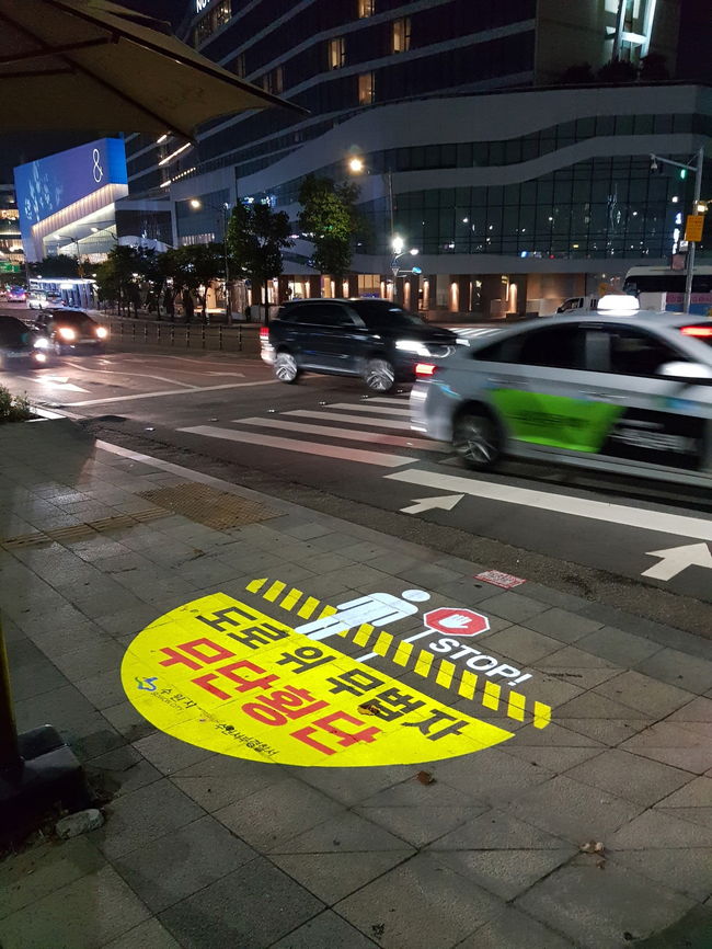 수원시가 교통사고가 많이 발생했던 수원역 주변 횡단보도 3곳에 무단횡단의 위험성을 알리는 문구를 투영하는 로고젝터를 설치했다.