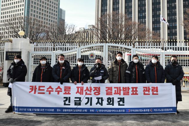 전국사무금융서비스노동조합, 전국금융산업노동조합, 카드사노동조합협의회는 27일 금융위원회 앞에서 `카드수수료 재산정 결과 발표 관련 긴급 기자회견`을 열었다.전국사무금융서비스노동조합, 전국금융산업노동조합, 카드사노동조합협의회는 27일 금융위원회 앞에서 `카드수수료 재산정 결과 발표 관련 긴급 기자회견`을 열고 "카드수수료 관련 당정협의 결과는 금융당국이 해야 할 일을 하지 않고 엉뚱한 곳의 팔을 비틀은 `정책 참사`"라고 비판했다.