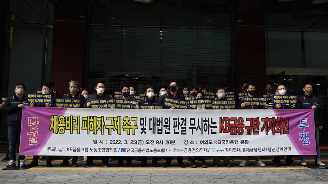 KB금융그룹 노동조합협의회 회원들은 25일 서울 영등포구 KB국민은행 본관 앞에서 ‘채용비리 피해자 구제 촉구 및 대법원 판결 무시 KB금융 규탄 기자회견’을 가졌다.