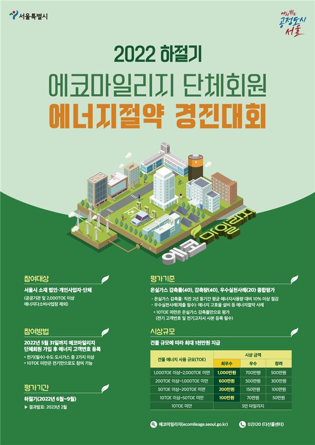 서울시는 여름철 6월에서 9월까지 에너지 사용 피크 기간 에너지 소비를 줄이고, 온실가스 감축을 장려하기 위한 `’22년 하절기 에코마일리지 단체회원 에너지절약 경진대회`를 오는 6월 1일부터 시작한다고 밝혔다.