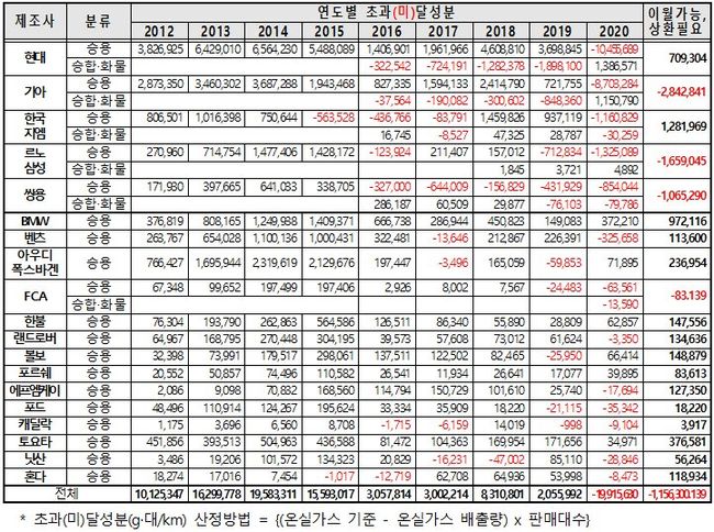 자동차 제작업체별 연도별 및 최종 초과(미)달성분*(~`20) (자료=환경부 제공)
