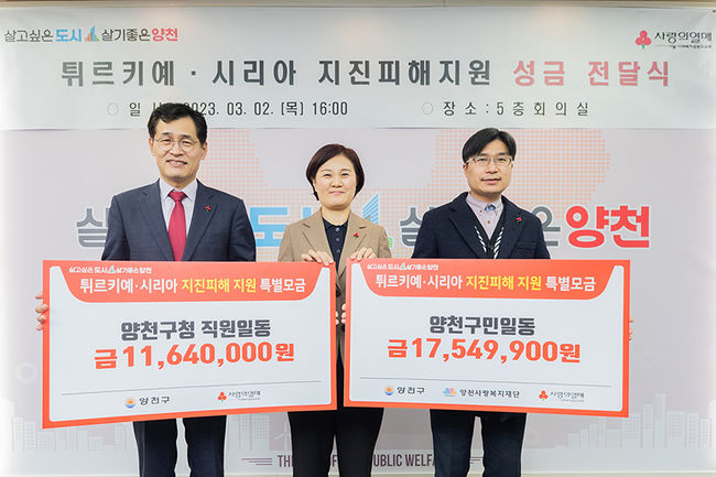 양천구는 튀르키예와 시리아 지역 이재민 구호활동 지원을 위한 성금 2900여만원을 서울사회복지공동모금회에 전달했다고 2일 밝혔다.