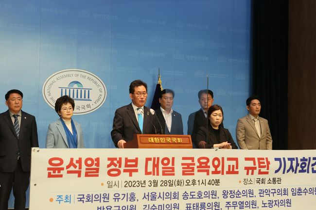 더불어민주당 유기홍 의원은 28일 국회 소통관에서 ‘윤석열 정부 대일 굴욕외교 규탄 기자회견’을 열어 “3월 16일부터 이틀간 도쿄에서 열린 한일정상회담은 굴종 외교의 정점이었다”며 “일본과의 관계개선만을 위해 모든 것을 양보하고 왔음에도 자화자찬하는 윤석열 대통령의 모습에 국민들은 분노하고 있다”고 밝혔다.