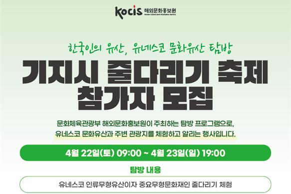 특히 올해는 유네스코 문화유산 탐방 사업 10주년이자 인류무형문화유산 보호 협약 20주년이 되는 해이면서, 2022년 ‘탈춤’의 인류무형문화유산 등재로 한국이 유네스코 인류무형문화유산 보유 세계 2위 국가(일본과 공동 2위)가 된 것을 기념해 ▲줄다리기와 ▲줄타기 ▲판소리 ▲택견 ▲해녀 ▲탈춤 ▲씨름 ▲김장 등 인류무형문화유산 체험으로 특화한 프로그램을 선사한다.