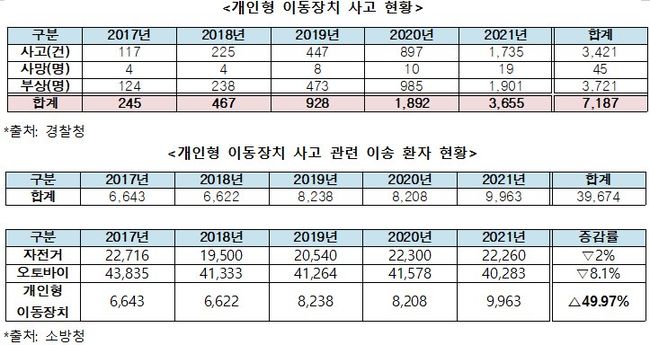 양 의원이 경찰청으로부터 받은 자료에 따르면, 최근 5년간(2017년~2021년) 개인형 이동장치 관련 사고는 2017년 117건에서 2021년 1,735건으로 약 15배 가까이 급증했다. 같은 기간 사고로 인한 사망자 수는 4명에서 19명(375% 증가), 부상자 수는 124명에서 1,901명(1,433% 증가)으로 폭증한 것으로 나타났다.