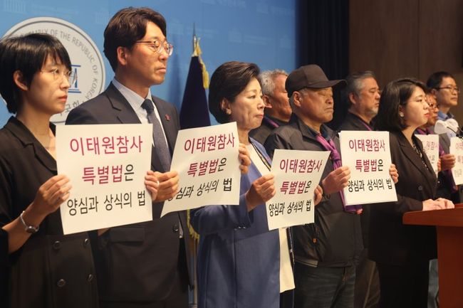 10.29 이태원 참사 유가족협의회와 시민대책회의가 15일 국회 소통관에서 기자회견을 열고 있다. 이들은 "이번 특별법은 의원 183명이 공동발의를 했다"며 국회의장을 제외한 나머지 116명 의원들을 상대로 "특별법을 통해 참사의 정확한 원인을 파악하고 책임을 따져야 제대로 된 재발방지 대책을 마련하고 희생자들을 온전히 추모할 수 있다"고 밝혔다.