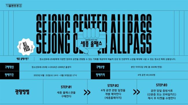 2023 세종 올패스는 6월21일 오후 2시부터 세종문화회관 홈페이지에서 구매 살 수 있으며 300매 한정이다.