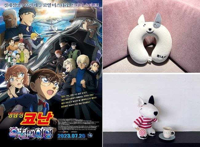 <명탐점 코난 : 흑철의 어영> 포스터 (왼쪽) BIAF2023 신규 굿즈 (드립백 커피, 목배게) (오른쪽)