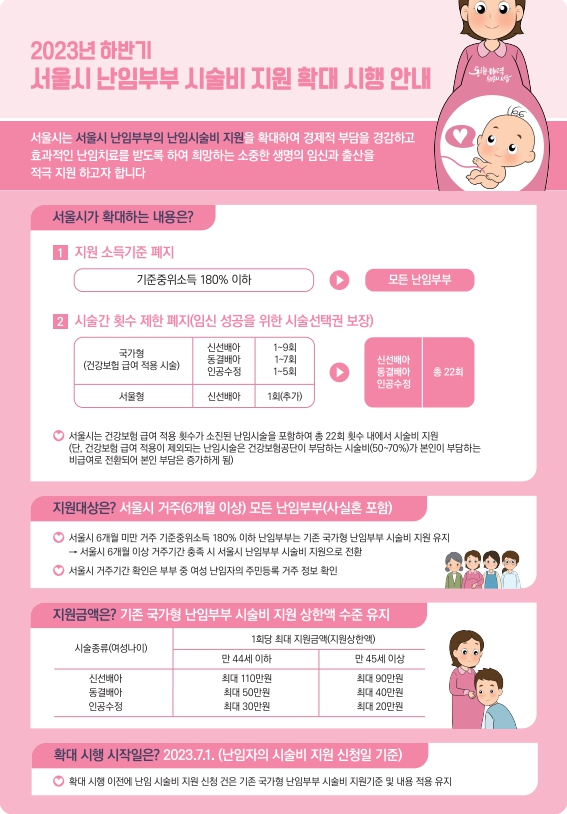 기존 지원 대상은 중위소득 180% 이하의 난임부부였지만, 7월부터는 소득 기준을 폐지해 대상자를 확대했다. 아울러 신선배아 10회, 동결배아 7회, 인공수정 5회 등 시술별 횟수 제한도 폐지해 총 22회 범위 안에서 희망하는 시술을 선택할 수 있도록 개선했다.