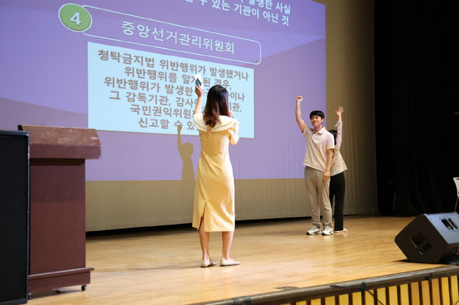 청렴 라이브 교육은 다양한 문화 공연을 활용한 콘서트 형식의 교육으로, △청탁금지법 위반과 관련된 딜레마 상황에서 올바른 선택은 무엇인지 질문을 제시하는 연극 ‘비타민’ △이해충돌방지법 등을 다룬 전문강사의 특강 △반부패 관련 문제를 풀어보는 청렴 골든벨 △청렴콘텐츠 공모전 수상작을 샌드아트로 재구성한 ‘별이 빛나는 밤에’가 진행됐다.
