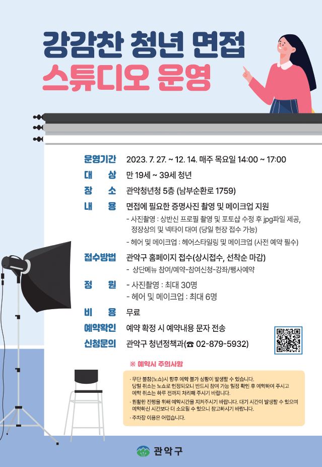 관악구가 오는 7월 27일부터 청년 취업 준비생의 면접 준비 비용 부담을 덜어주기 위해 ‘강감찬 청년 면접 스튜디오’를 운영한다고 밝혔다.