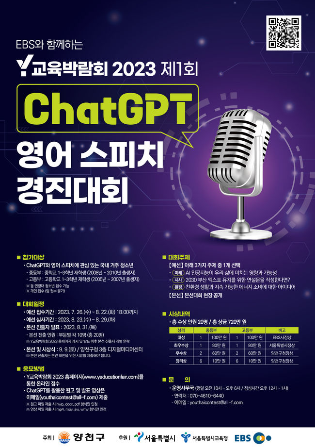 양천구와 한국교육방송공사(EBS)가 공동 추진하는 ‘Y교육박람회’의 일환인 이번 대회는 전국 최초로 ‘영어 말하기 대회’에 ‘챗GPT’를 접목, 생성형 인공지능(AI)의 기술수준을 청소년이 직접 체험하며 원고를 작성하는 과정에서 비판적인 수용능력과 창의·논리력을 갖춘 글로벌 미래 인재를 육성하고자 마련됐다.