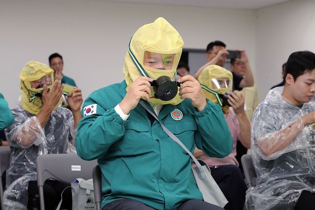 그곳에서 지역주민과 함께 화생방 방독면 착용과 심폐소생술을 체험하고, 비상시 국민행동요령에 대한 교육도 받았다.