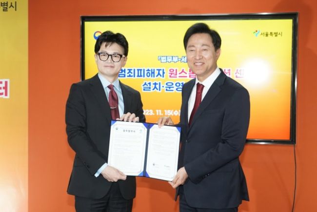 오세훈 시장은 15일 오후 동작구 서울여성플라자에서 한동훈 법무부장관과 「‘범죄피해자 원스톱 솔루션센터’ 설치·운영을 위한 업무협약」을 체결했다.