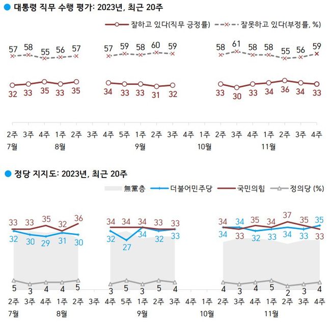 한국갤럽이 2023년 11월 넷째 주(21~23일) 전국 만 18세 이상 유권자 1,001명에게 윤석열 대통령이 현재 대통령으로서의 직무를 잘 수행하고 있다고 보는지 잘못 수행하고 있다고 보는지 물은 결과, 33%가 긍정 평가했고 59%는 부정 평가했으며 그 외는 의견을 유보했다(어느 쪽도 아님 3%, 모름/응답거절 5%).