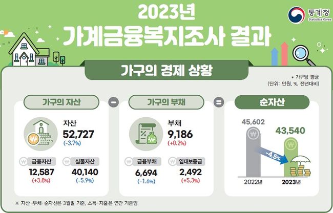 가구당 평균 자산은 전년 대비 3.7% 줄어든 5억2727만원이었고, 자산에서 부채를 뺀 순자산도 4억3540만원으로 4.5% 감소했다. 금융부채 대비 저축액 비율은 75.7%로 감소하면서 가계의 부채상환 능력이 일부 개선된 측면이 있었다. 그러나 기획재정부는 부동산 가격 상승이 가계의 체감 수준에 영향을 미칠 수 있으므로 주의가 필요하다고 설명했다.