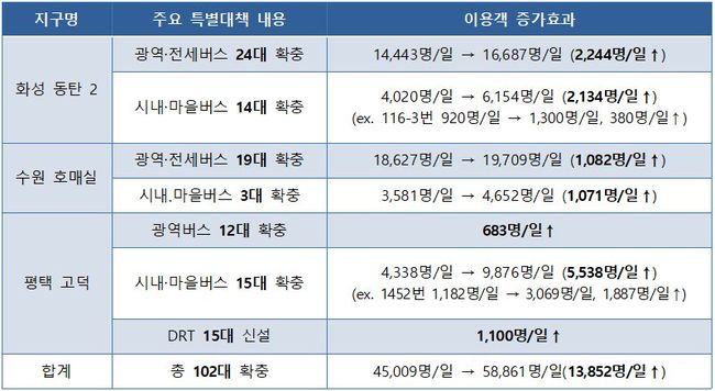 광역교통 특별․보완대책 수립 및 이행에 따른 주요 효과는, 우선 특별대책 지구로 지정된 화성 동탄 2, 수원 호매실, 평택 고덕지구의 경우, 화성 동탄 2는 광역․전세버스 24대 확충으로 이용객 2,244명/일 증가, 시내․마을버스 14대 확충으로 이용객 2,134명/일 증가했다.