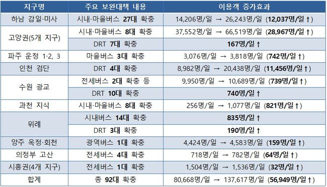 마지막으로, 양주 옥정․회천지구는 광역버스 1대 확충으로 이용객 159명/일 증가, 의정부 고산지구는 전세버스 4대 확충으로 이용객 64명/일 증가, 시흥권(군자․목감․은계․장현)은 전세버스 1대 확충으로 이용객 32명/일 증가했다.
