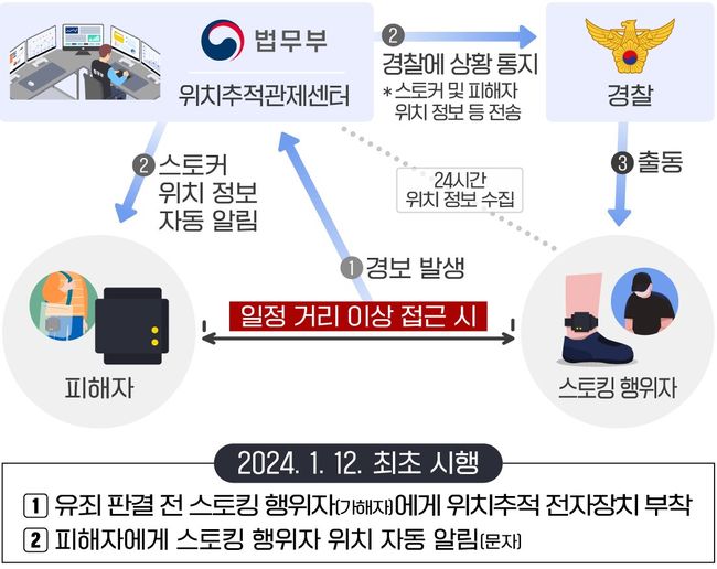 스토킹 가해자가 접근 시 피해자에게 가해자의 접근사실이 자동으로 문자전송 되고, 경찰이 신속히 출동하는 등 피해자 보호조치도 한층 강화될 예정이다. 그래픽=법무부 제공