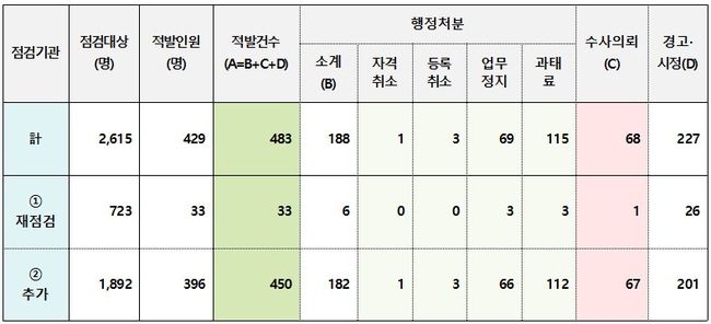 자격취소 1건, 등록취소 3건, 업무정지 69건, 과태료 부과 115건의 행정처분(188건)을 진행 중이며, 경미한 사항에 대하여는 점검 현장에서 경고 및 시정(227건) 조치했다.