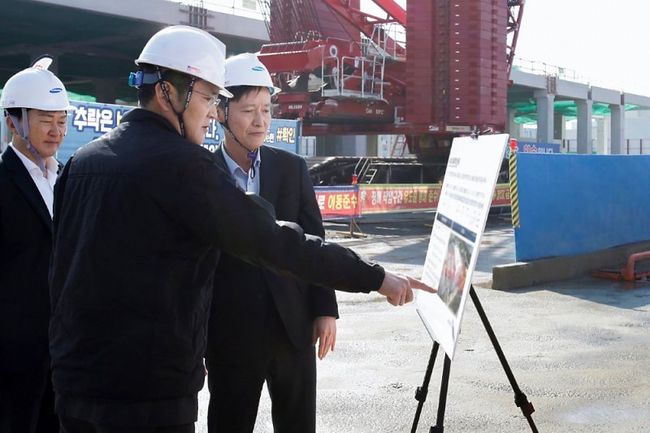 16일 삼성바이오로직스 인천사업장을 찾은 이재용 회장이 ADC(Antibody-drug conjugate, 항체-약물 접합체) 제조시설 건설 현장에서 관계자 브리핑을 듣고 있다.
