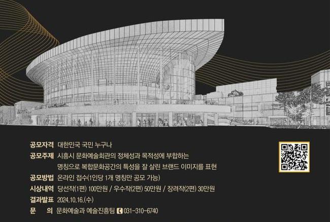 공모 내용은 시흥시 문화예술회관(가칭)의 정체성과 독창성을 잘 표현할 수 있는 이름을 찾기 위한 것으로, 브랜드 가치와 상징성을 반영한 아이디어를 모집한다. 참가 자격 및 접수 방법에 관한 자세한 정보는 시흥시 누리집의 `시정소식-시정정보` 고시공고 게시판에서 확인할 수 있다.