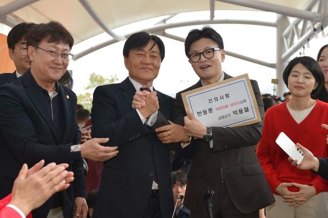 박용철 강화군수는 지난 22일 오후 3시 강화 풍물시장을 찾은 국민의힘 한동훈 대표를 만나 군 현안사업을 설명하고 강화군 발전을 위한 건의사항을 전달했다.