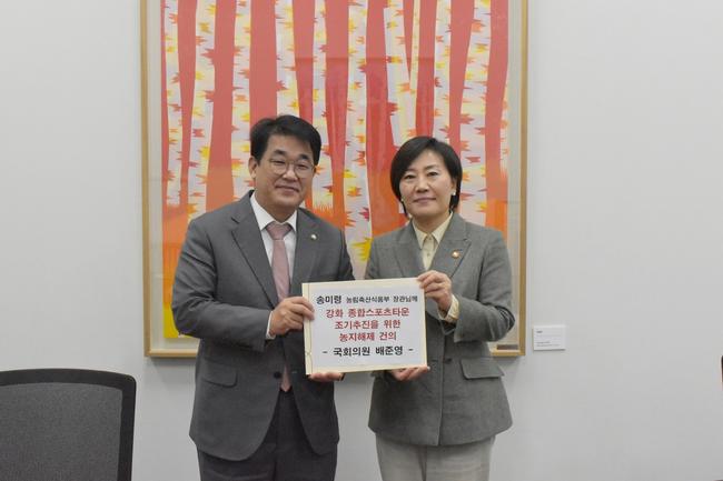 강화군(군수 박용철)은 지난 11월 28일 민선 10기 핵심 공약인 `강화군 종합 스포츠타운 조성사업`의 성공적 추진을 위해 배준영 국회의원실을 찾아 현안을 협의했다. 배준영 의원은 이날 바로 송미령 농림축산식품부 장관을 만나 `농업진흥지역 해제`를 요청해 사업 추진에 탄력을 받을 전망이다.