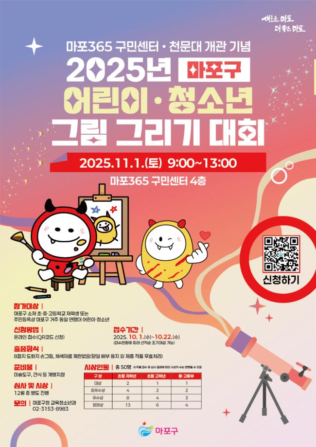 마포구 어린이 청소년 그림 그리기 대회 포스터.서울 마포구(구청장 박강수)는 마포365구민센터와 마포365천문대 개관을 기념해 개최하는 ‘2025년 하반기 어린이·청소년 그림 그리기 대회’ 참가자를 22일까지 모집한다고 밝혔다.