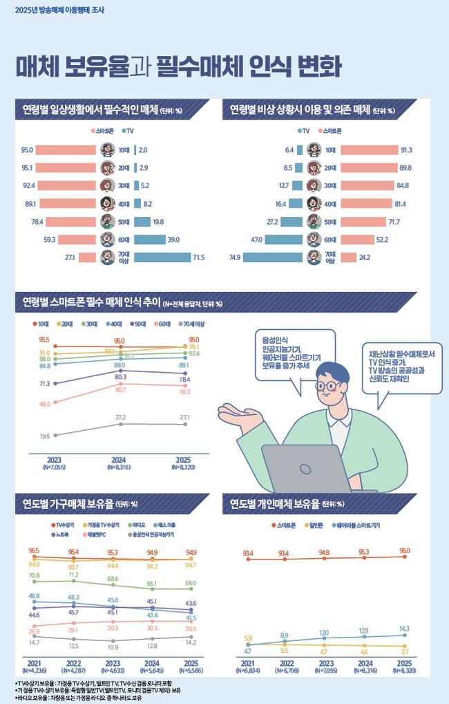 매체 중요도 인식에서도 변화가 감지됐다. 일상생활에서 필수 매체로 인식하는 비율은 스마트폰이 74.9%로 소폭 감소한 반면, TV는 23.0%로 상승했다. 재해·재난 상황에서는 TV를 필수 매체로 꼽은 비율이 29.7%로 전년 대비 8.4%p 급증했다. 재난 발생 시 가장 신뢰하는 매체 역시 TV 방송이 59.1%로 가장 높았다.