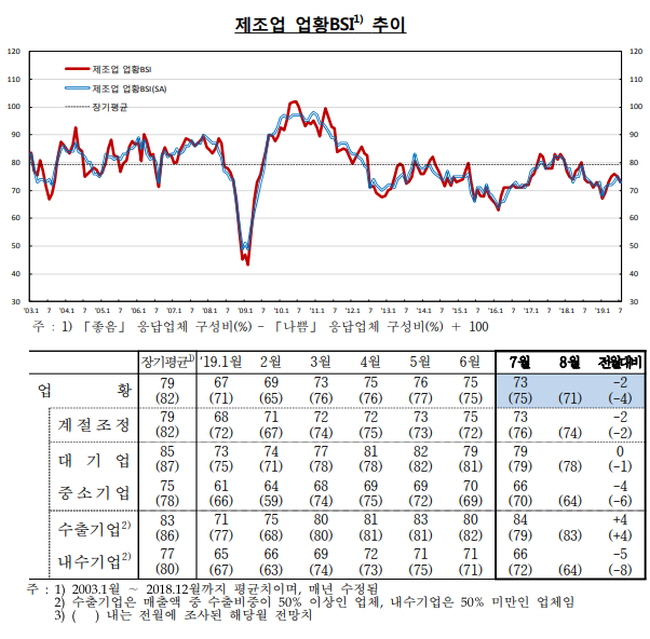7월 들어 일본 수출 규제 이슈가 불거졌지만 기업 체감 경기는 큰 폭으로 내려가지 않은 모양새다. 한은 관계자는 “일본 수출규제를 두고 기업들이 구체적인 피해가 있다는 답을 많이 내놓지는 않았다”고 말했다.