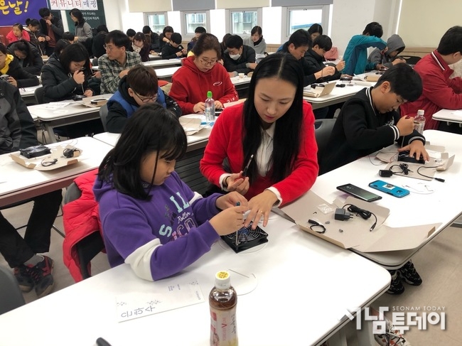 자원봉사자들이 미니 공기청정기를 조립하고 있다. (사진=부천시)부천시자원봉사센터는 지난 16일 학교 앞 미세먼지 커뮤니티매핑 프로젝트의 후속 활동으로 시민자원봉사자(가족·청소년) 50명과 함께 미니 공기청정기 50개를 만들어 미세먼지에 취약한 영유아·독거노인 가정에 배달하는 봉사활동을 진행했다.